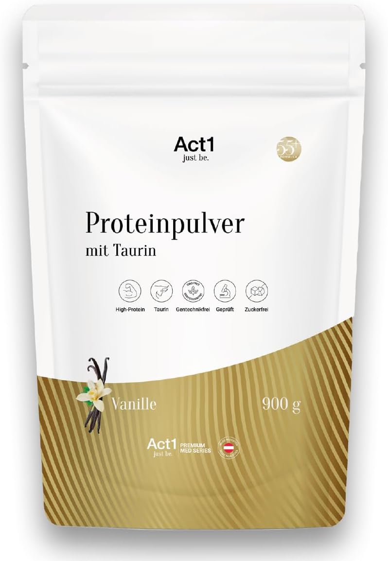 Act1 Premium MED|Series Whey Protein + Taurine – Your source of energy and muscle power. Experience the perfect combination of high-quality whey protein and the invigorating power of taurine with Act1 Premium MED|Series Whey Protein + Taurine. Our unique blend is designed to support your fitness goals and give you the energy you need for an active lifestyle, ideal for all ages. Why Act1 Premium MED|Series Whey + Taurine? - Unique blend: Our special formula combines high-quality whey protein with taurine to promote muscle growth, recovery, and additional energy. - Muscle growth and recovery: Supports the growth and recovery of your muscles so you always perform at your best. - Additional energy boost: Taurine provides the energy you need to tackle your training and everyday life at full power. - Delicious vanilla flavor: Enjoy our creamy vanilla shake, perfect before or after training, or as a protein-rich snack between meals. - Suitable for all ages: Whether you're a young fitness enthusiast or part of the 55+ generation, Act1 Premium MED|Series supports your health and vitality. Recommended use: Mix 30g (1 scoop) with 250ml of water and enjoy your Act1 Premium MED|Series shake after training or as part of your daily diet.